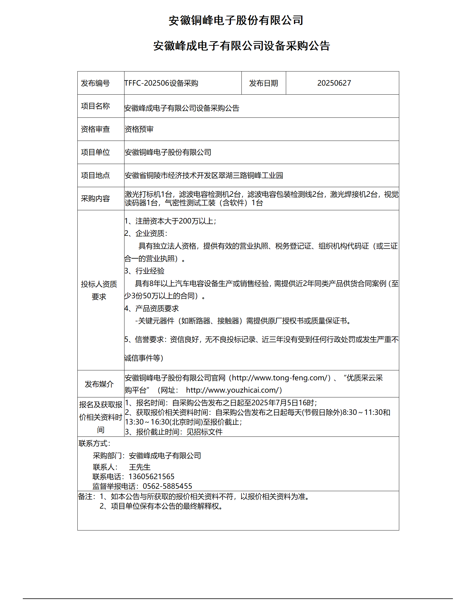 安徽峰成電子有限公司設備采購公告_01