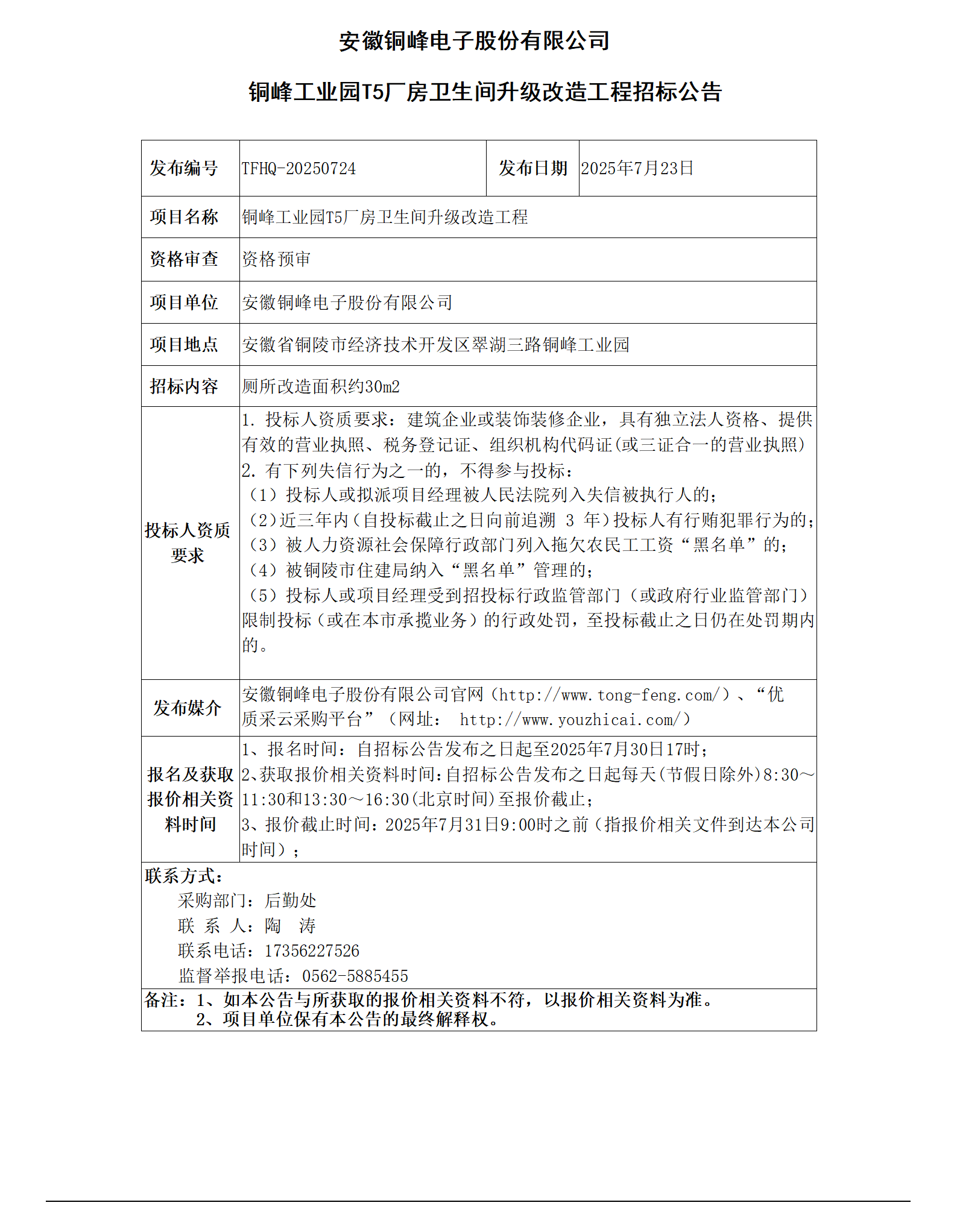 安徽銅峰電子股份有限公司 (銅峰工業(yè)園T5廠(chǎng)房衛(wèi)生間升級(jí)改造工程招標(biāo)公告)_01